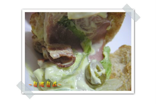 裡面配料:生菜+起司片+火腿片+酸黃瓜+大黃瓜+黑橄欖+芥末醬